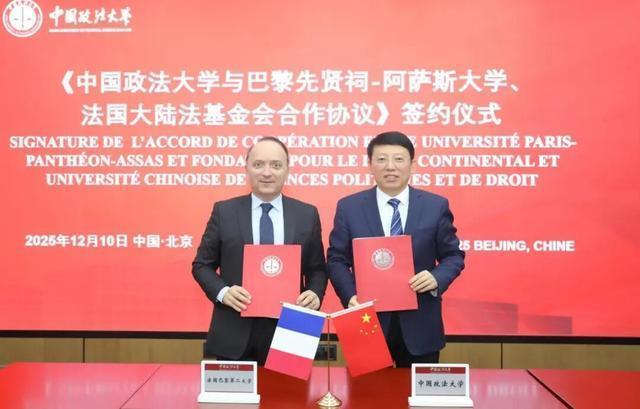 在莫逸飞等人的见证下,双方代表共同签署《中国政法大学与巴黎先贤祠-阿萨斯大学(巴黎第二大学)、法国大陆法基金会合作协议》,并为中国政法大学中法法学院揭牌。