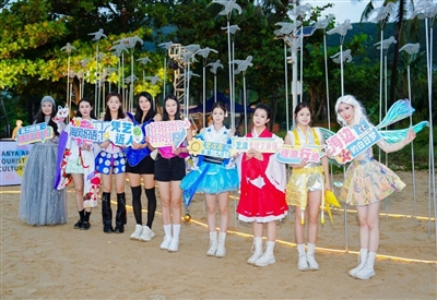 12月1日,在天涯海角游览区的沙滩上,一场Cosplay巡游与千年礁石并肩呈现。不远处的“情绪二次元”区域,近50位身着华丽服饰的Coser达人随着音乐即兴起舞,舞曲的节奏与海风交织。有人停下脚步,在留言板上提笔写下心愿,将情绪封存于天涯的黄昏。