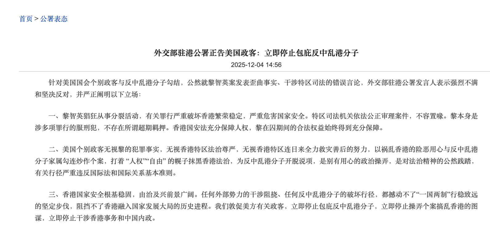 12月4日,外交部驻港公署官网发文正告美国政客:立即停止包庇反中乱港分子。