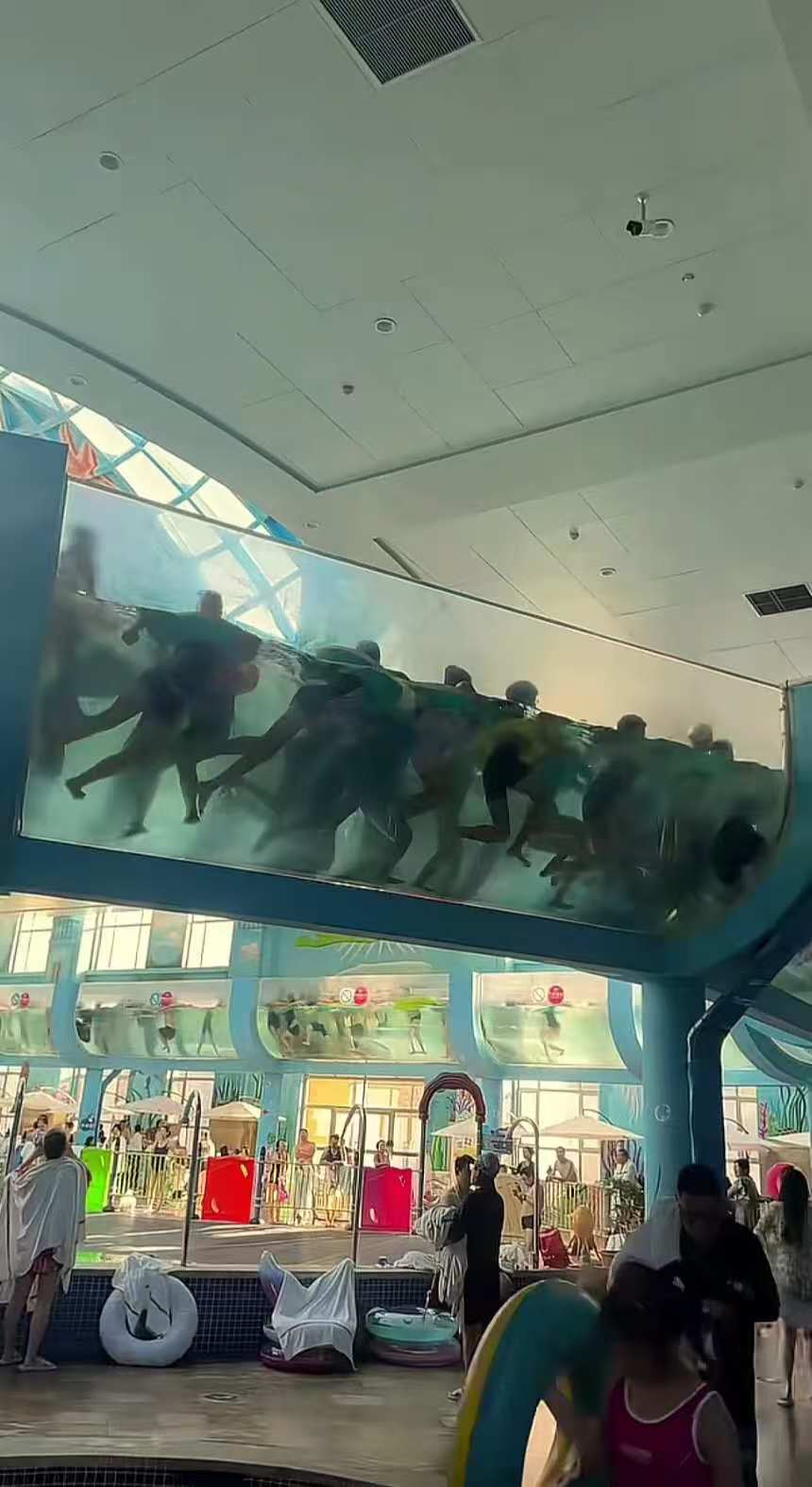 画面显示,在该酒店室内一个水上项目中,有一定数量游客进行体验,有网友认为人数较多,看起来较为浑浊,或影响水质,也有人担心存在皮肤病,但也有网友称,只是最近节假日人较多,人少的时候体验感很好。