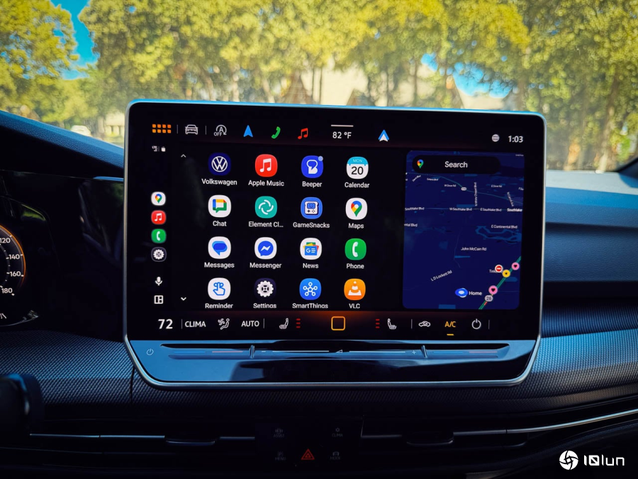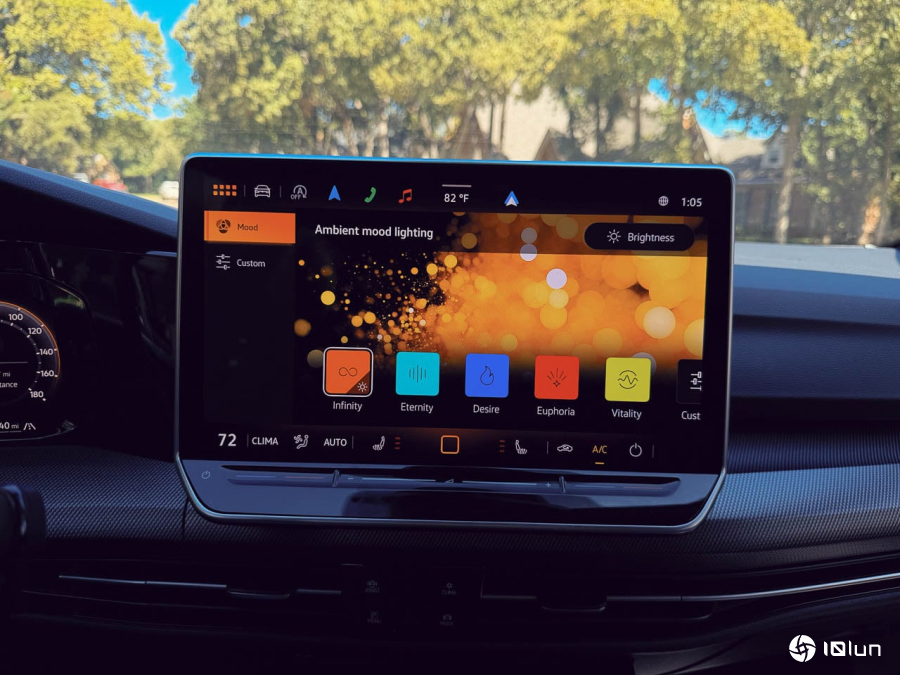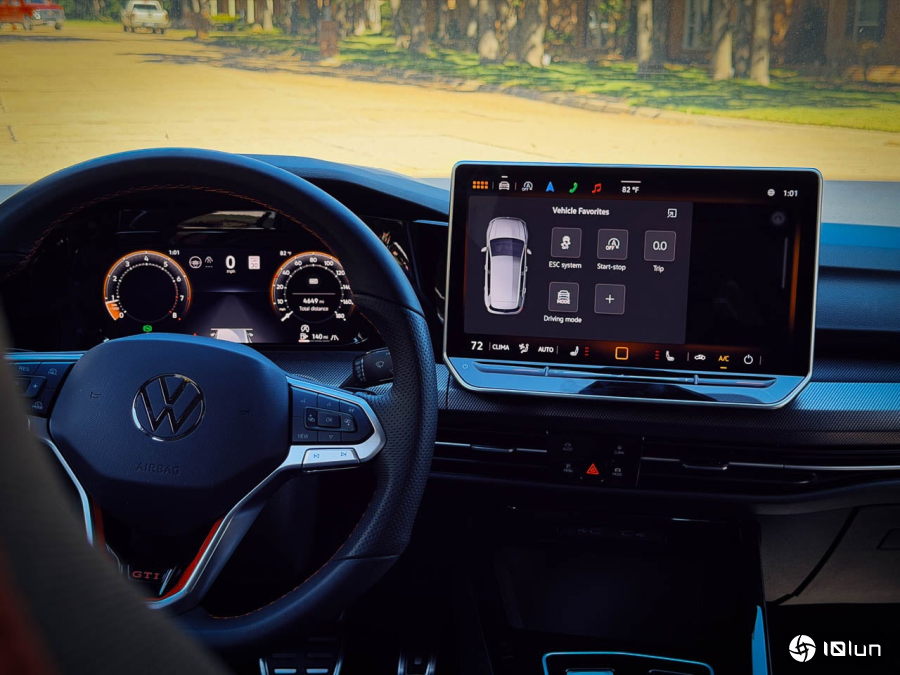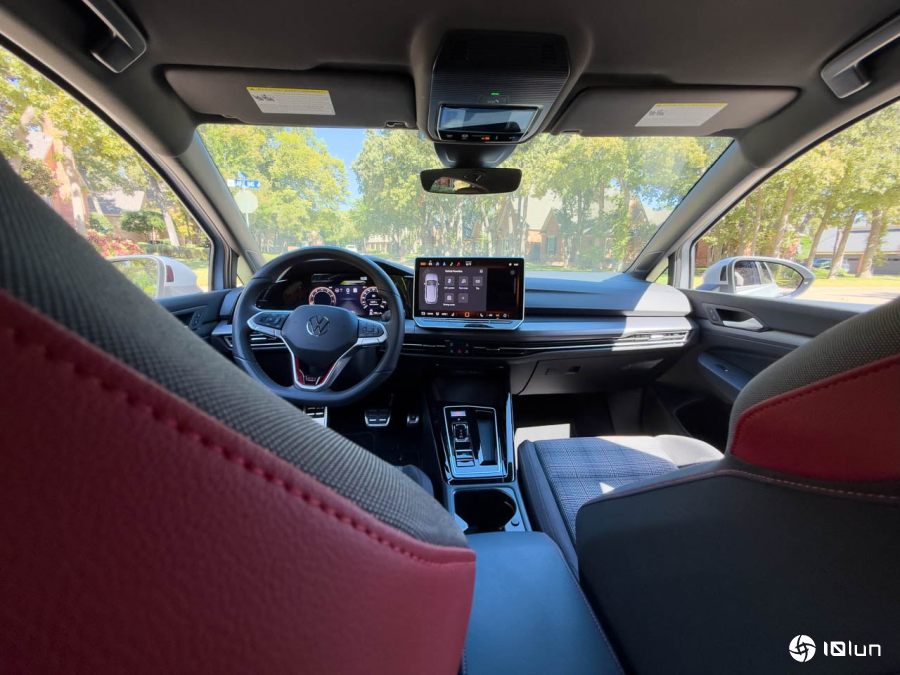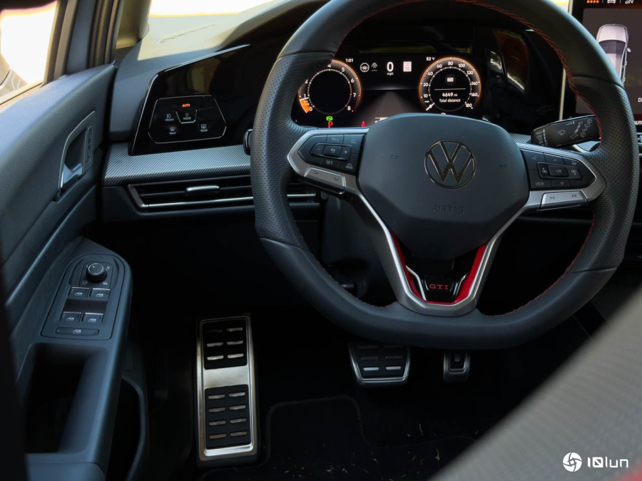 双10.25英寸显示屏横跨仪表台宽度,边框细到几乎可以视为一块连续的表面,仅被方向柱打断。气候和音量的触感滑块位于中控台原有实体按钮的位置。这是GTI在界面趋势与触感传统之间唯一可见的让步,以视觉连贯性为代价,付出的是轻微的人体工学成本。适应期真实但短暂。
