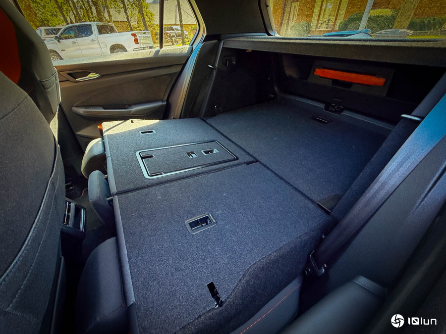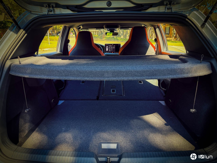 掀背车身形态提供了轿车竞争对手难以匹敌的实用性。后备箱容积从座椅直立时的22.8立方英尺可展开至折叠后座后达到52.7立方英尺,后排靠背仅需一次拉杆即可精准折叠。载货平面与后保险杠齐平,地毯面坚实到可以顺滑滑动箱子而不卡顿。这种实用性没有视觉妥协,车顶线保持运动倾斜,同时容纳了真正有用的内部空间。