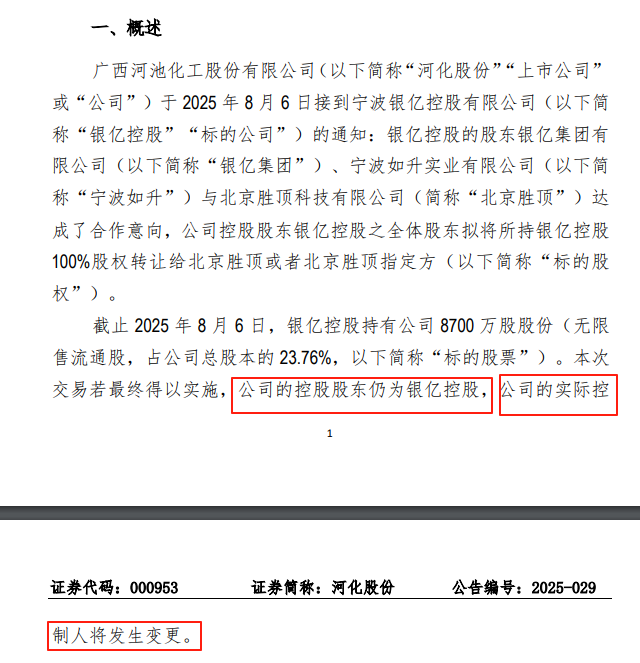 近日,河化股份(000953)披露了一系列关于控股股东宁波银亿控股有限公司(以下简称“银亿控股”)拟变更控制权的公告。8月6日晚间,河化股份公告称,公司控股股东银亿控股之全体股东拟将所持银亿控股100%股权转让给北京胜顶科技有限公司(以下简称“北京胜顶”)或者北京胜顶指定方。本次交易若最终得以实施,公司的控股股东仍为银亿控股,公司的实际控制人将发生变更。