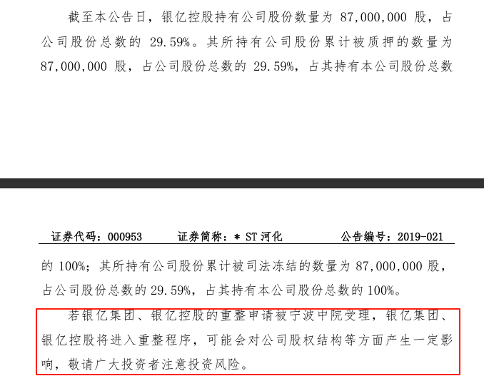 河化股份在2019年6月18日披露的提示性公告显示,控股股东母公司银亿集团、控股股东银亿控股持续面临流动性危机,若其进入重整程序,可能会对公司股权结构等方面产生一定影响。